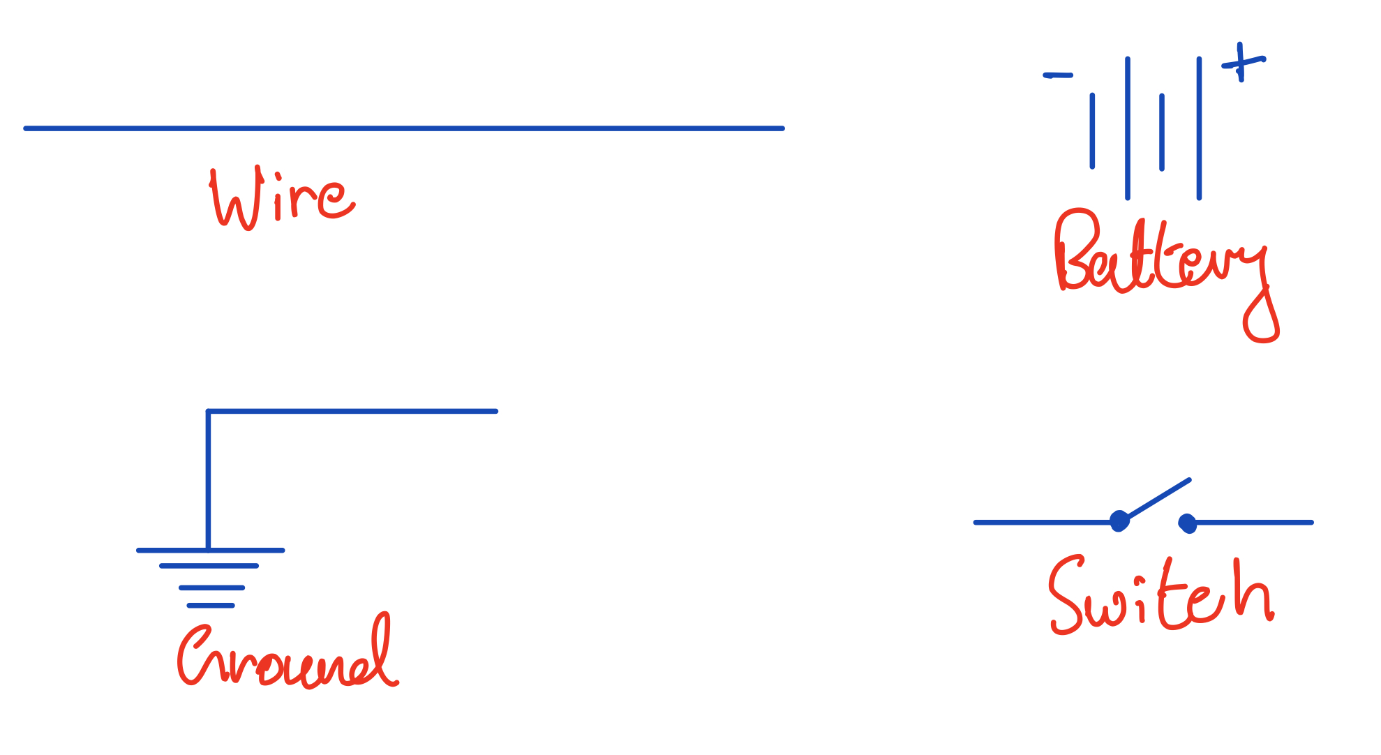 A battery is a component which creates a high electric potential through one of its ends and a low one through the other end, meaning that there will be a voltage across the wire connected to the positive end of the battery. We can use this to create high and low voltages. We should also introduce the concept of a ground here. A ground, in the context of electronics, is a reference point against which we measure other voltages. It is usually taken as having zero volts. This is also sometimes referred to as earth.