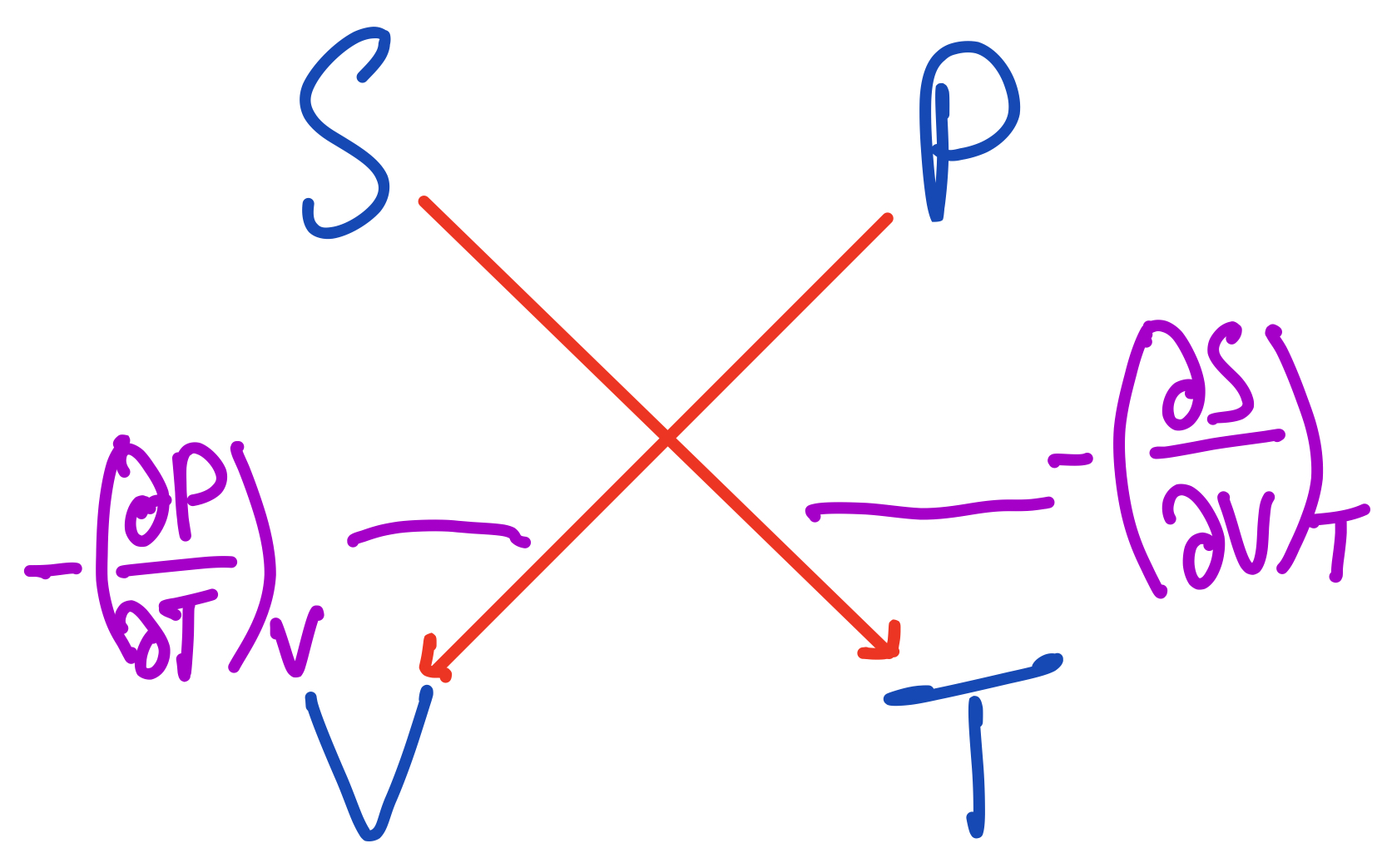 $$ (\frac{\partial T}{\partial V})_S = -(\frac{\partial P}{\partial S})_V $$ $$ (\frac{\partial T}{\partial P})_S = (\frac{\partial V}{\partial S})_P $$ $$ (\frac{\partial P}{\partial T})_V = (\frac{\partial S}{\partial V})_T $$ $$ (\frac{\partial V}{\partial T})_P = -(\frac{\partial S}{\partial P})_T $$